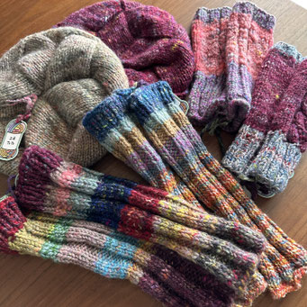 ニットベレー帽にレッグウォーマー、ハンドウォーマー。全て手紡ぎ糸で手編みしています。暖かさも格別です。
