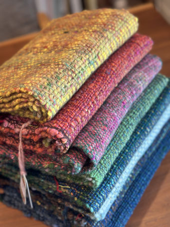 まだまだ紹介しきれない手紡ぎ手織り作品、大判ショールやアートヤーン。どうぞ糸フェス会場に足をお運びください。